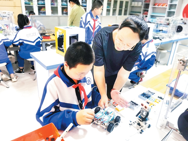 9月7日,太原市万柏林区公园路小学五年四班胡昭宇同学在老师指导下认真组装机器人。同学们在该校机器人社团中能够学到许多课本中没有的知识,提高动手能力。